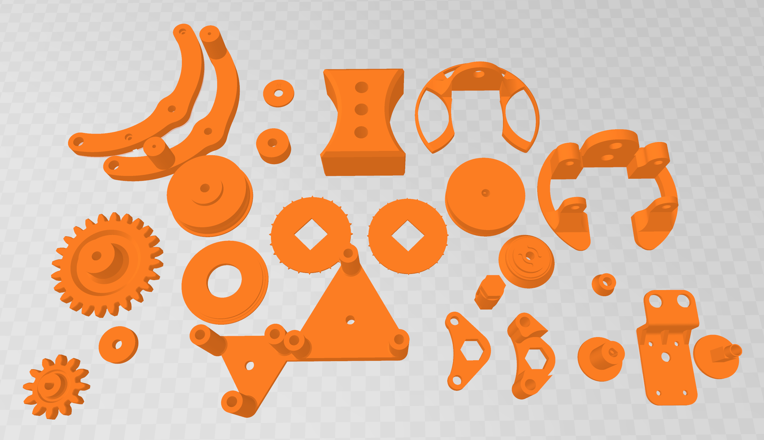 The printed parts include the rollers, the sprocket and associated mechanics for pulling the film, and several structural pieces to keep the rollers centered in the tank and align the overall structure.
