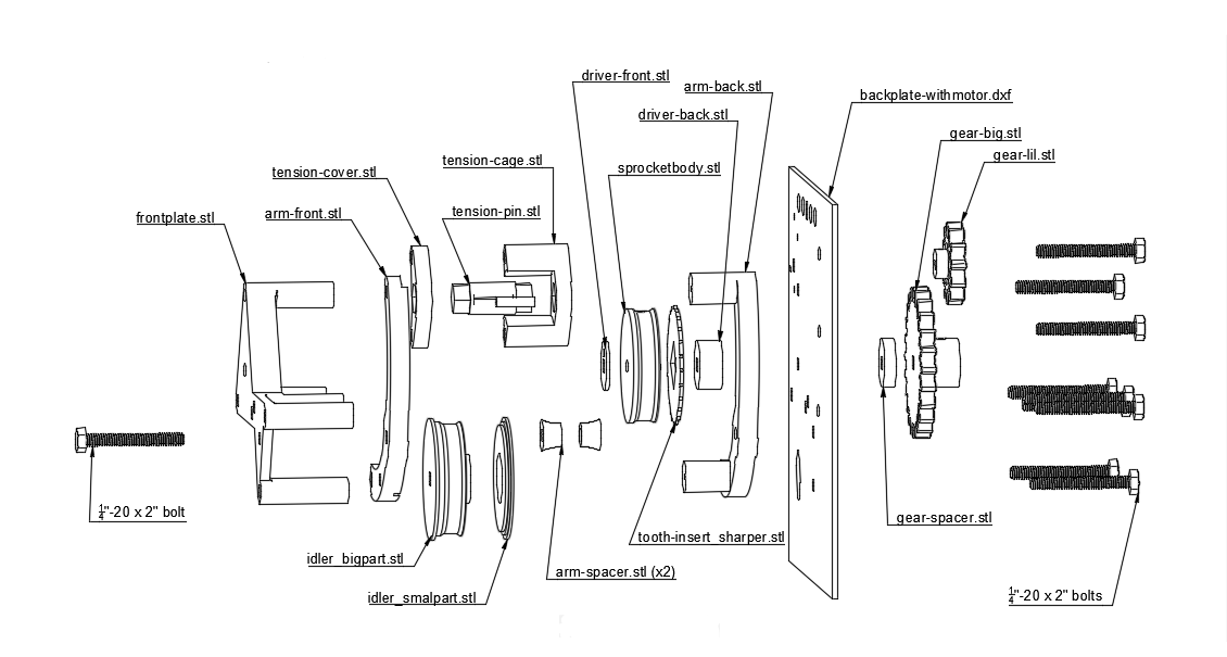 This section covers a recently-developed change to the SLP design. Where previously a salvaged projector sprocket and clamping roller were used (and certainly still could be, if you wish to adapt one), the design now includes files to 3D print a sprocket mechanism to pull the film through the tanks.