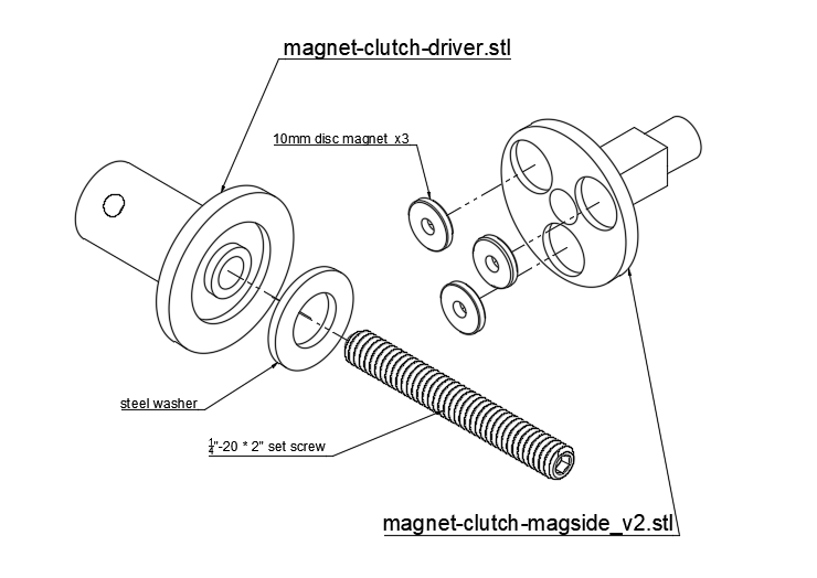 Next it's time to build the takeup mechanism. Far simpler in comparison to the film driver; the takeup consists of a motor, 3 printed parts, 3 magnets, a washer, and a 2-inch set screw. You'll also need an adhesive, which can be superglue or the plastic epoxy previously used to connect the spacer blocks to the tanks. (In retrospect, maybe too many things are called spacers...)